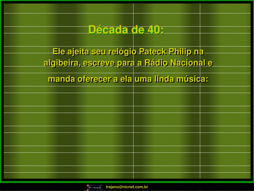 Década de 40: Ele ajeita seu relógio Pateck Philip na algibeira, escreve para a Rádio Nacional e manda oferecer a ela uma linda música: