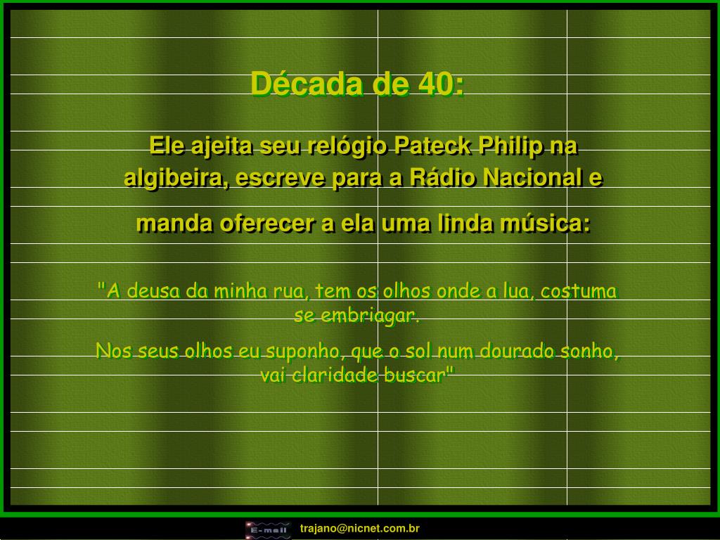 Década de 40: Ele ajeita seu relógio Pateck Philip na algibeira, escreve para a Rádio Nacional e manda oferecer a ela uma linda música: "A deusa da minha rua, tem os olhos onde a lua, costuma se embriagar. Nos seus olhos eu suponho, que o sol num dourado sonho, vai claridade buscar"