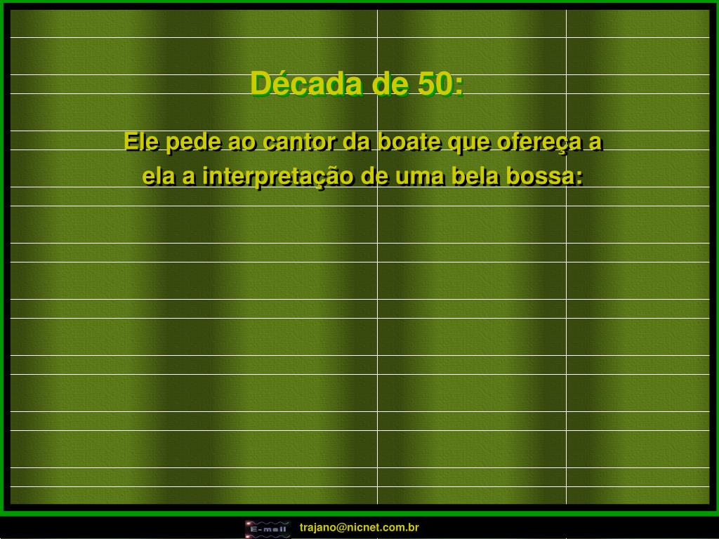 Década de 50: Ele pede ao cantor da boate que ofereça a ela a interpretação de uma bela bossa: