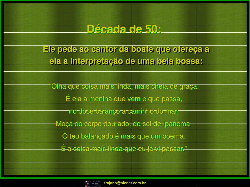 Década de 50: Ele pede ao cantor da boate que ofereça a ela a interpretação de uma bela bossa: "Olha que coisa mais linda, mais cheia de graça. É ela a menina que vem e que passa, no doce balanço a caminho do mar. Moça do corpo dourado, do sol de Ipanema. O teu balançado é mais que um poema. É a coisa mais linda que eu já vi passar."