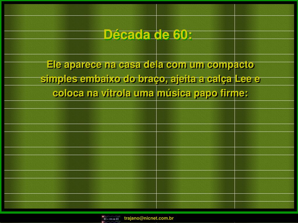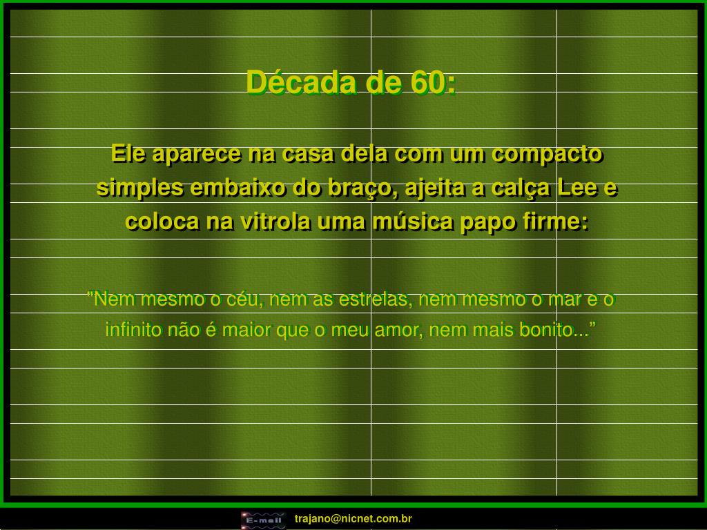 Década de 60: Ele aparece na casa dela com um compacto simples embaixo do braço, ajeita a calça Lee e coloca na vitrola uma música papo firme: "Nem mesmo o céu, nem as estrelas, nem mesmo o mar e o infinito não é maior que o meu amor, nem mais bonito...”