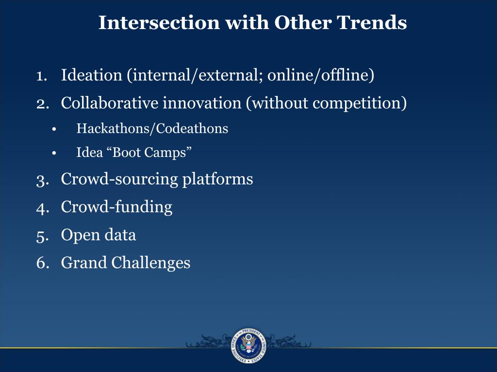 Intersection with Other Trends • Ideation (internal/external; online/offline) • Collaborative innovation (without competition) • Hackathons/Codeathons • Idea “Boot Camps” • Crowd-sourcing platforms • Crowd-funding • Open data • Grand Challenges
