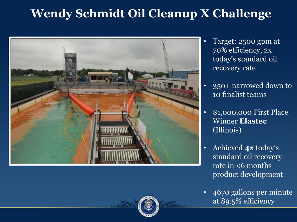 Wendy Schmidt Oil Cleanup X Challenge • Target: 2500 gpm at 70% efficiency, 2x today’s standard oil recovery rate • 350+ narrowed down to 10 finalist teams • $1,000,000 First Place Winner Elastec(Illinois) • Achieved 4x today’s standard oil recovery rate in <6 months product development • 4670 gallons per minute at 89.5% efficiency