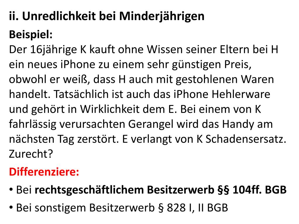 ii. Unredlichkeit bei Minderjährigen Beispiel:Der 16jährige K kauft ohne Wissen seiner Eltern bei H ein neues iPhone zu einem sehr günstigen Preis, obwohl er weiß, dass H auch mit gestohlenen Waren handelt. Tatsächlich ist auch das iPhoneHehlerware und gehört in Wirklichkeit dem E. Bei einem von K fahrlässig verursachten Gerangel wird das Handy am nächsten Tag zerstört. E verlangt von K Schadensersatz. Zurecht? Differenziere: • Bei rechtsgeschäftlichem Besitzerwerb §§ 104ff. BGB • Bei sonstigem Besitzerwerb § 828 I, II BGB
