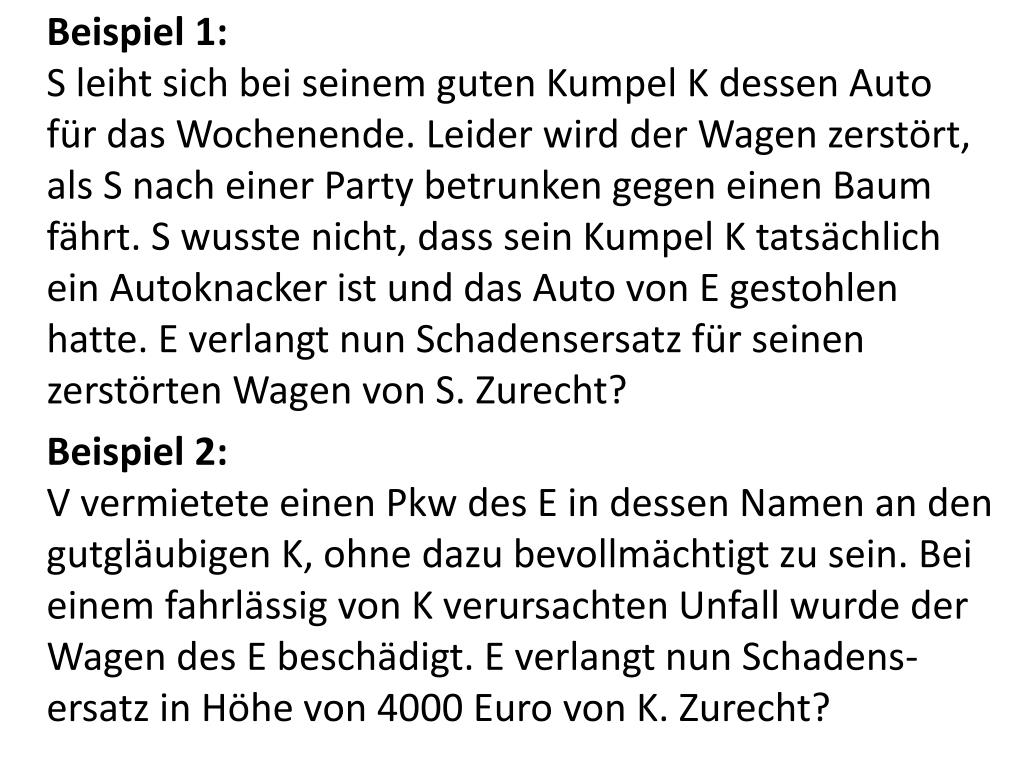 Beispiel 1:S leiht sich bei seinem guten Kumpel K dessen Auto für das Wochenende. Leider wird der Wagen zerstört, als S nach einer Party betrunken gegen einen Baum fährt. S wusste nicht, dass sein Kumpel K tatsächlich ein Autoknacker ist und das Auto von E gestohlen hatte. E verlangt nun Schadensersatz für seinen zerstörten Wagen von S. Zurecht? Beispiel 2:V vermietete einen Pkw des E in dessen Namen an den gutgläubigen K, ohne dazu bevollmächtigt zu sein. Bei einem fahrlässig von K verursachten Unfall wurde der Wagen des E beschädigt. E verlangt nun Schadens-ersatz in Höhe von 4000 Euro von K. Zurecht?