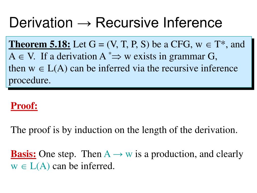 Derivation → Recursive Inference Theorem 5.18: Let G = (V, T, P, S) be a CFG, w T*, and A V. If a derivation A * w exists in grammar G, then w L(A) can be inferred via the recursive inference procedure. Proof: The proof is by induction on the length of the derivation. Basis: One step. Then A → w is a production, and clearly w L(A) can be inferred.