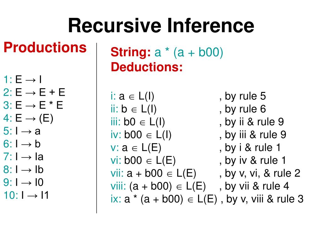Productions 1: E → I 2: E → E + E 3: E → E * E 4: E → (E) 5: I → a 6: I → b 7: I → Ia 8: I → Ib 9: I → I0 10: I → I1 String:a * (a + b00) Deductions: i: a L(I) , by rule 5 ii: b L(I) , by rule 6 iii: b0 L(I) , by ii & rule 9 iv: b00 L(I) , by iii & rule 9 v: a L(E) , by i & rule 1 vi: b00 L(E) , by iv & rule 1 vii: a + b00 L(E) , by v, vi, & rule 2 viii: (a + b00) L(E) , by vii & rule 4 ix: a * (a + b00) L(E) , by v, viii & rule 3 Recursive Inference