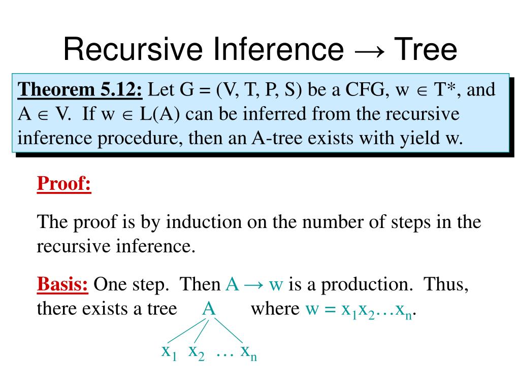 Recursive Inference → Tree Theorem 5.12: Let G = (V, T, P, S) be a CFG, w T*, and A V. If w L(A) can be inferred from the recursive inference procedure, then an A-tree exists with yield w. Proof: The proof is by induction on the number of steps in the recursive inference. Basis: One step. Then A → w is a production. Thus, there exists a tree A where w = x1x2…xn. x1 x2 … xn