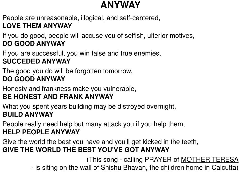 ANYWAY People are unreasonable, illogical, and self-centered, LOVE THEM ANYWAY If you do good, people will accuse you of selfish, ulterior motives, DO GOOD ANYWAY If you are successful, you win false and true enemies, SUCCEDED ANYWAY The good you do will be forgotten tomorrow, DO GOOD ANYWAY Honesty and frankness make you vulnerable, BE HONEST AND FRANK ANYWAY What you spent years building may be distroyed overnight, BUILD ANYWAY People really need help but many attack you if you help them, HELP PEOPLE ANYWAY Give the world the best you have and you'll get kicked in the teeth, GIVE THE WORLD THE BEST YOU'VE GOT ANYWAY (This song - calling PRAYER of MOTHER TERESA - is siting on the wall of Shishu Bhavan, the children home in Calcutta)