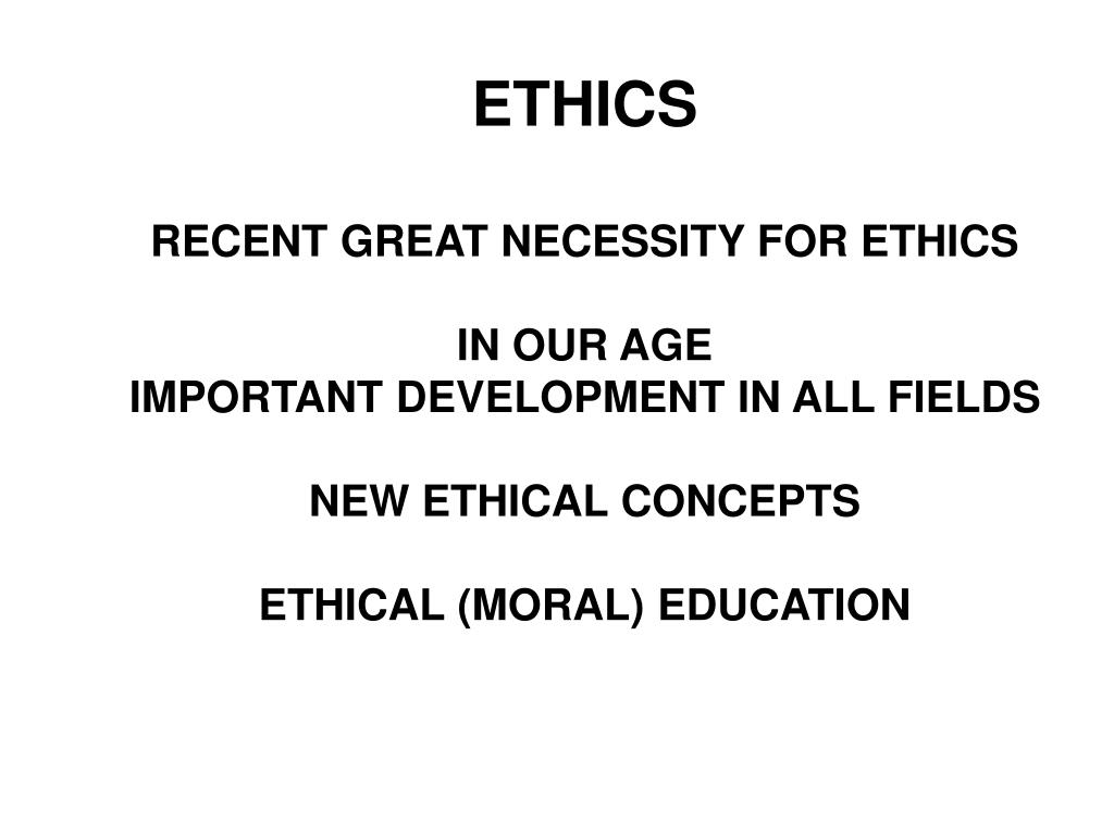 ETHICS RECENT GREAT NECESSITY FOR ETHICS IN OUR AGE IMPORTANT DEVELOPMENT IN ALL FIELDS NEW ETHICAL CONCEPTS ETHICAL (MORAL) EDUCATION