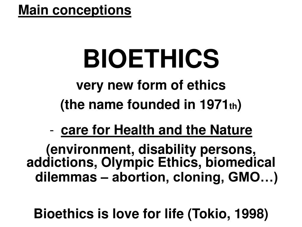Main conceptions BIOETHICS very new form of ethics (the name founded in 1971th) • care for Health and the Nature (environment, disability persons, addictions, Olympic Ethics, biomedical dilemmas – abortion, cloning, GMO…) Bioethics is love for life (Tokio, 1998)