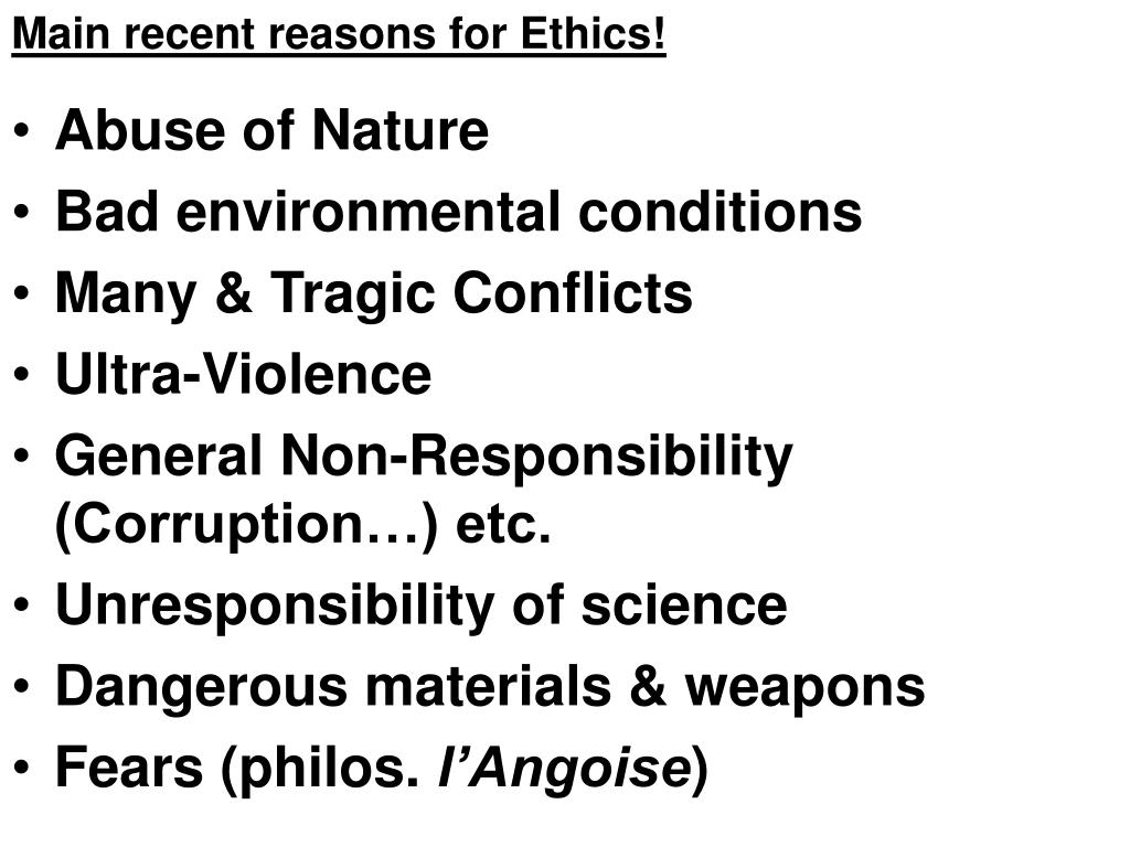 Main recent reasons for Ethics! Abuse of Nature Bad environmental conditions Many & Tragic Conflicts Ultra-Violence General Non-Responsibility (Corruption…) etc. Unresponsibility of science Dangerous materials & weapons Fears (philos. l’Angoise)