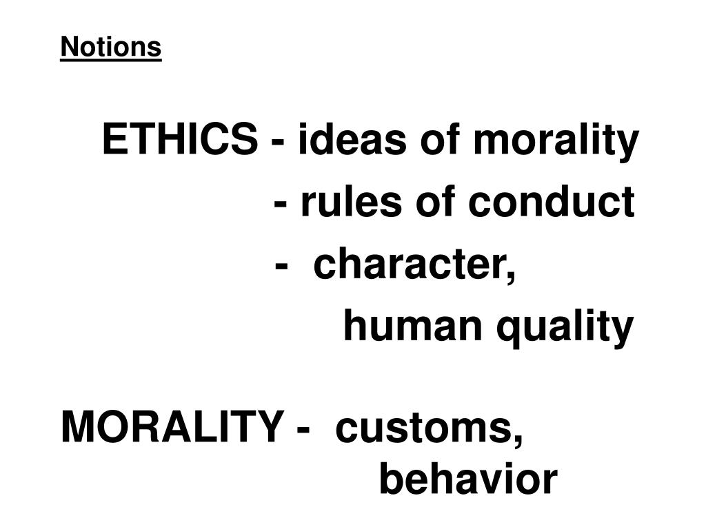 Notions ETHICS - ideas of morality - rules of conduct - character, human quality MORALITY - customs, behavior