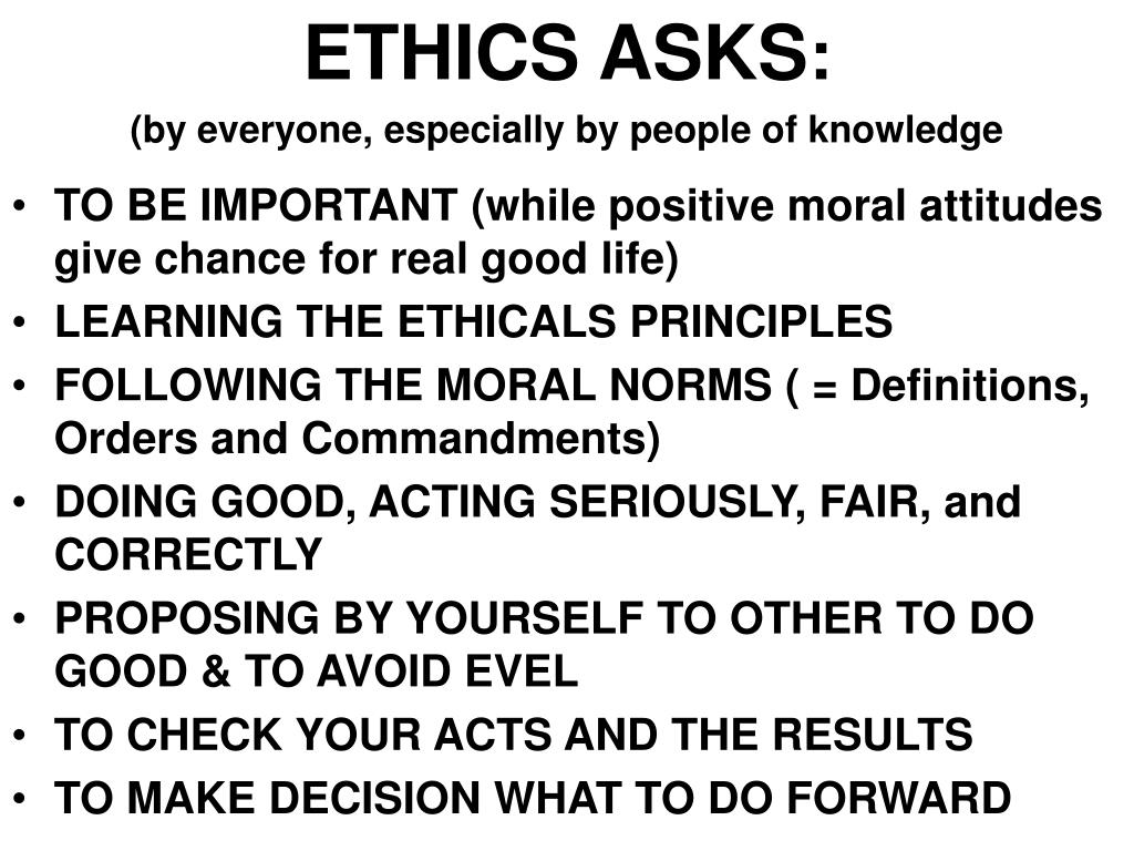 ETHICS ASKS: (by everyone, especially by people of knowledge • TO BE IMPORTANT (while positive moral attitudes give chance for real good life) • LEARNING THE ETHICALS PRINCIPLES • FOLLOWING THE MORAL NORMS ( = Definitions, Orders and Commandments) • DOING GOOD, ACTING SERIOUSLY, FAIR, and CORRECTLY • PROPOSING BY YOURSELF TO OTHER TO DO GOOD & TO AVOID EVEL • TO CHECK YOUR ACTS AND THE RESULTS • TO MAKE DECISION WHAT TO DO FORWARD