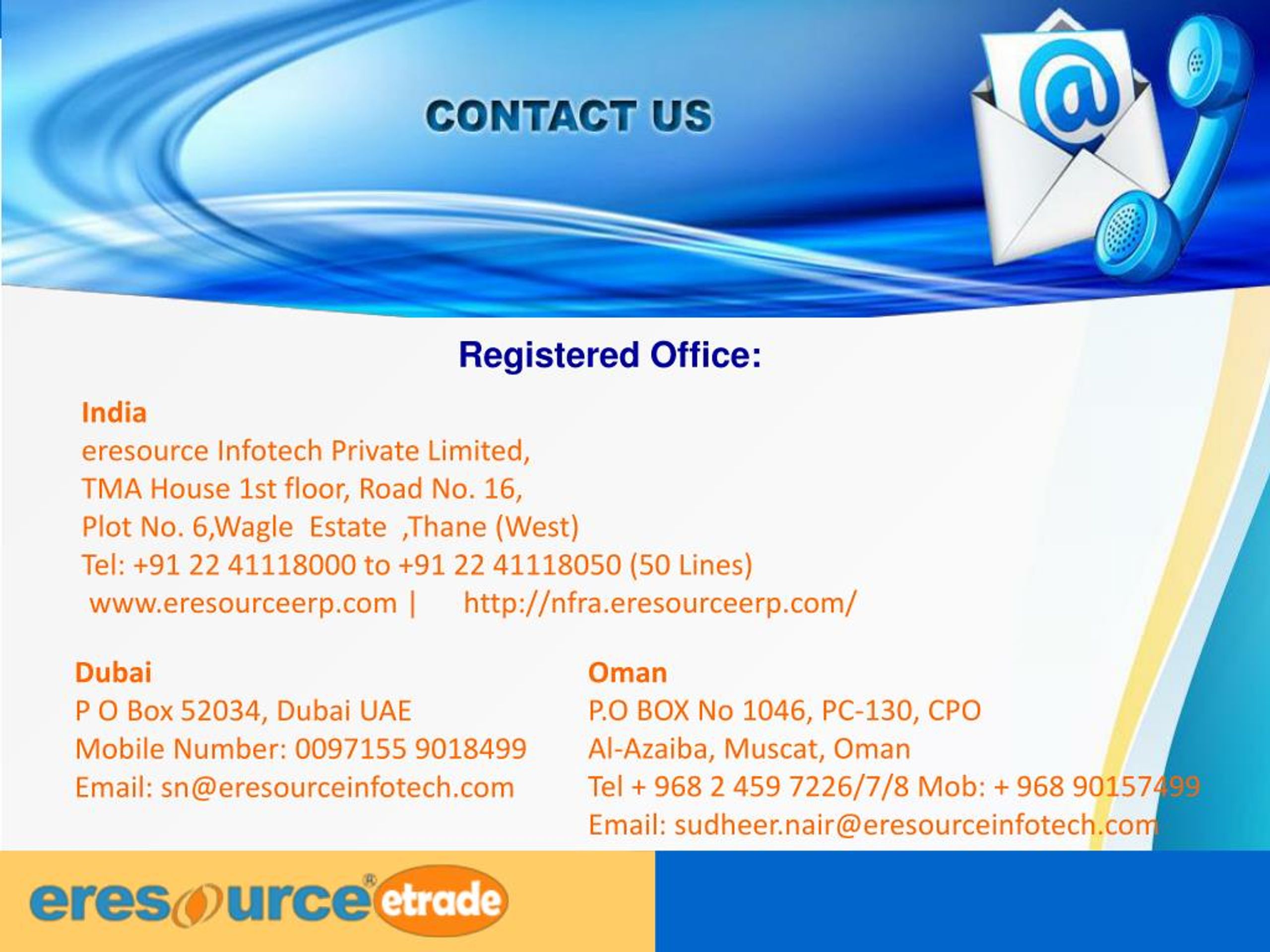 Registered Office: India eresource Infotech Private Limited, TMA House 1st floor, Road No. 16, Plot No. 6,Wagle Estate ,Thane (West) Tel: +91 22 41118000 to +91 22 41118050 (50 Lines) www.eresourceerp.com | http://nfra.eresourceerp.com/ Oman P.O BOX No 1046, PC-130, CPO Al-Azaiba, Muscat, Oman Tel + 968 2 459 7226/7/8 Mob: + 968 90157499 Email: sudheer.nair@eresourceinfotech.com Dubai P O Box 52034, Dubai UAE Mobile Number: 0097155 9018499 Email: sn@eresourceinfotech.com