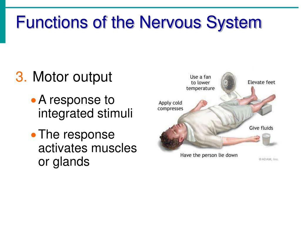 Functions of the Nervous System • Motor output • A response to integrated stimuli • The response activates muscles or glands
