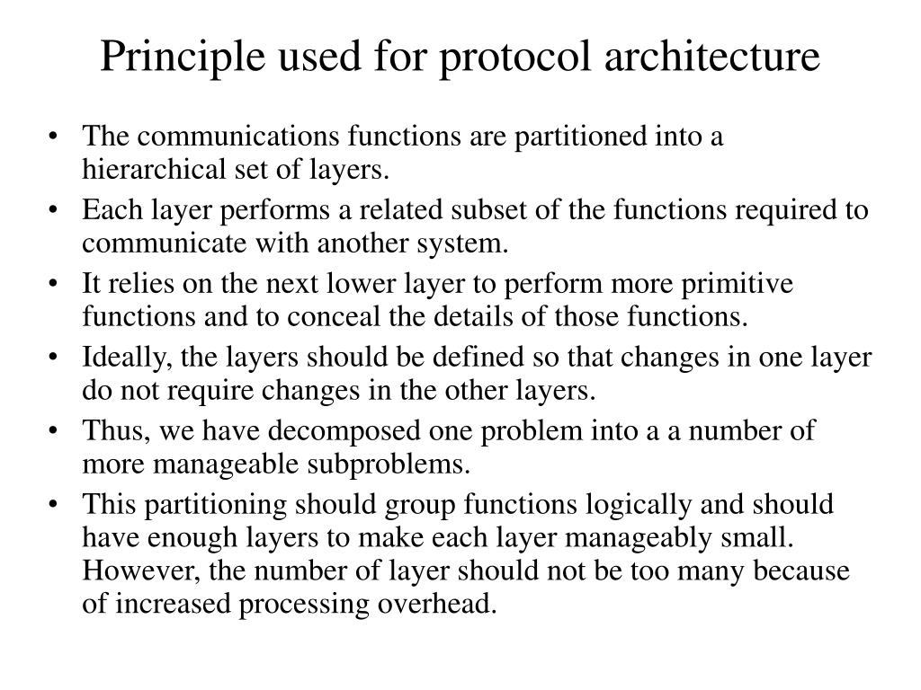 Principle used for protocol architecture • The communications functions are partitioned into a hierarchical set of layers. • Each layer performs a related subset of the functions required to communicate with another system. • It relies on the next lower layer to perform more primitive functions and to conceal the details of those functions. • Ideally, the layers should be defined so that changes in one layer do not require changes in the other layers. • Thus, we have decomposed one problem into a a number of more manageable subproblems. • This partitioning should group functions logically and should have enough layers to make each layer manageably small. However, the number of layer should not be too many because of increased processing overhead.