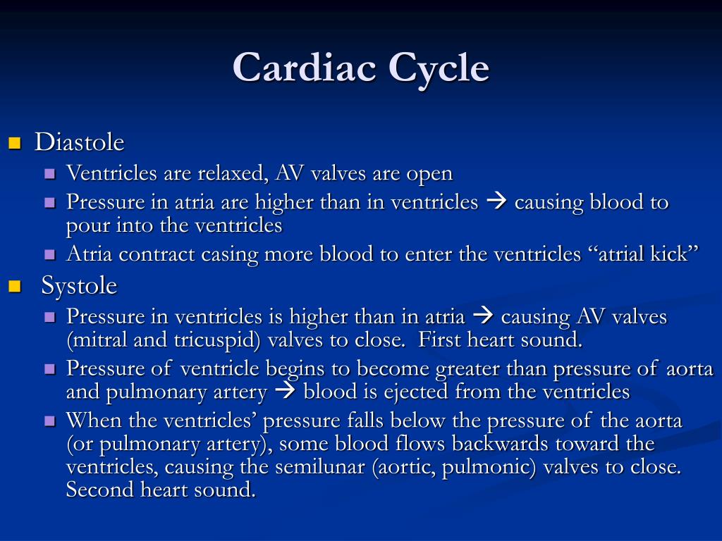 Cardiac Cycle • Diastole • Ventricles are relaxed, AV valves are open • Pressure in atria are higher than in ventricles causing blood to pour into the ventricles • Atria contract casing more blood to enter the ventricles “atrial kick” • Systole • Pressure in ventricles is higher than in atria causing AV valves (mitral and tricuspid) valves to close. First heart sound. • Pressure of ventricle begins to become greater than pressure of aorta and pulmonary artery blood is ejected from the ventricles • When the ventricles’ pressure falls below the pressure of the aorta (or pulmonary artery), some blood flows backwards toward the ventricles, causing the semilunar (aortic, pulmonic) valves to close. Second heart sound.