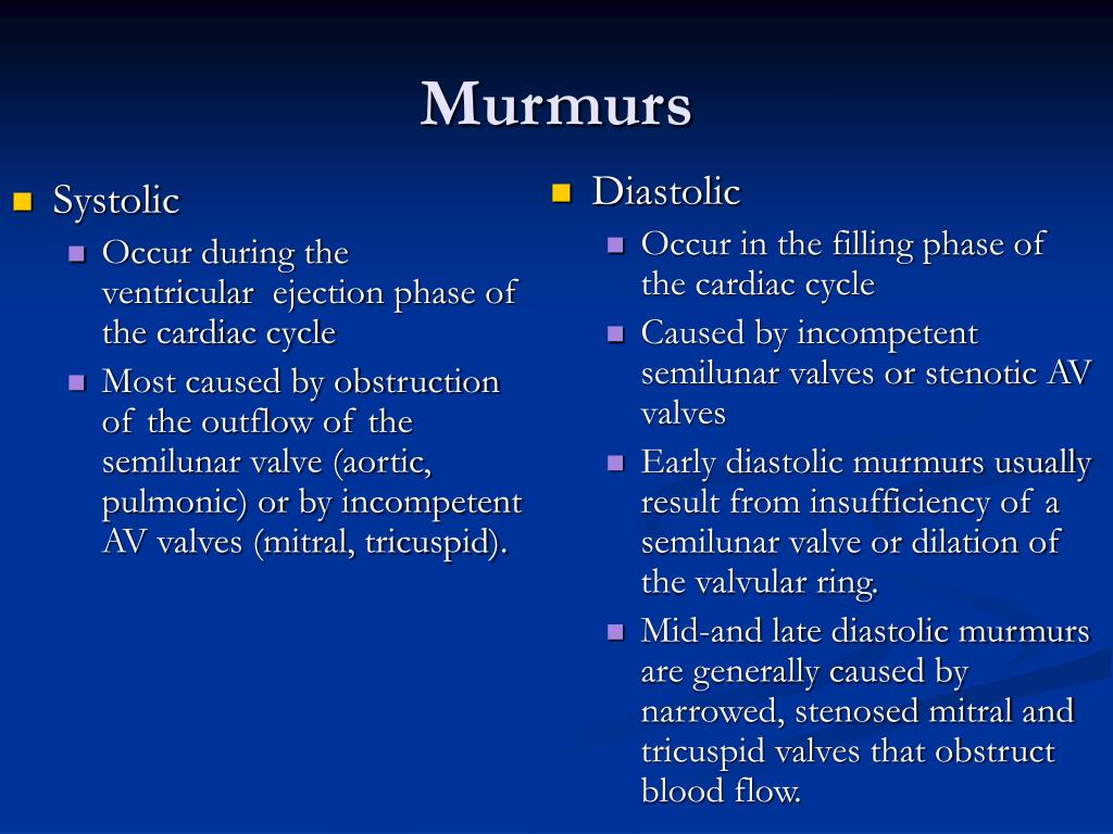 Systolic Occur during the ventricular ejection phase of the cardiac cycle Most caused by obstruction of the outflow of the semilunar valve (aortic, pulmonic) or by incompetent AV valves (mitral, tricuspid). Diastolic Occur in the filling phase of the cardiac cycle Caused by incompetent semilunar valves or stenotic AV valves Early diastolic murmurs usually result from insufficiency of a semilunar valve or dilation of the valvular ring. Mid-and late diastolic murmurs are generally caused by narrowed, stenosed mitral and tricuspid valves that obstruct blood flow. Murmurs