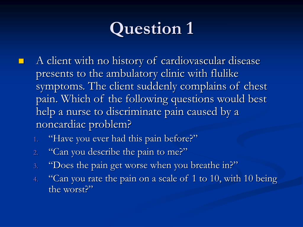 Question 1 • A client with no history of cardiovascular disease presents to the ambulatory clinic with flulike symptoms. The client suddenly complains of chest pain. Which of the following questions would best help a nurse to discriminate pain caused by a noncardiac problem? • “Have you ever had this pain before?” • “Can you describe the pain to me?” • “Does the pain get worse when you breathe in?” • “Can you rate the pain on a scale of 1 to 10, with 10 being the worst?”