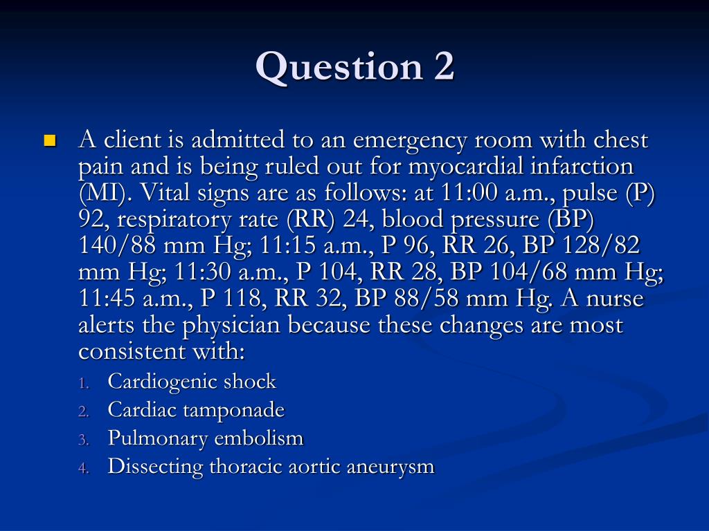 Question 2 • A client is admitted to an emergency room with chest pain and is being ruled out for myocardial infarction (MI). Vital signs are as follows: at 11:00 a.m., pulse (P) 92, respiratory rate (RR) 24, blood pressure (BP) 140/88 mm Hg; 11:15 a.m., P 96, RR 26, BP 128/82 mm Hg; 11:30 a.m., P 104, RR 28, BP 104/68 mm Hg; 11:45 a.m., P 118, RR 32, BP 88/58 mm Hg. A nurse alerts the physician because these changes are most consistent with: • Cardiogenic shock • Cardiac tamponade • Pulmonary embolism • Dissecting thoracic aortic aneurysm