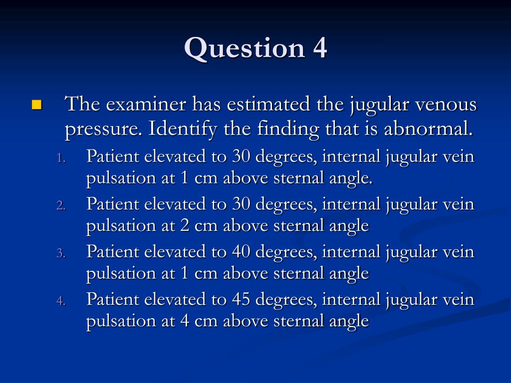 Question 4 • The examiner has estimated the jugular venous pressure. Identify the finding that is abnormal. • Patient elevated to 30 degrees, internal jugular vein pulsation at 1 cm above sternal angle. • Patient elevated to 30 degrees, internal jugular vein pulsation at 2 cm above sternal angle • Patient elevated to 40 degrees, internal jugular vein pulsation at 1 cm above sternal angle • Patient elevated to 45 degrees, internal jugular vein pulsation at 4 cm above sternal angle