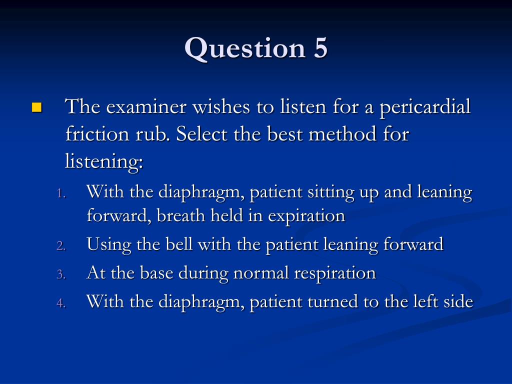 Question 5 • The examiner wishes to listen for a pericardial friction rub. Select the best method for listening: • With the diaphragm, patient sitting up and leaning forward, breath held in expiration • Using the bell with the patient leaning forward • At the base during normal respiration • With the diaphragm, patient turned to the left side