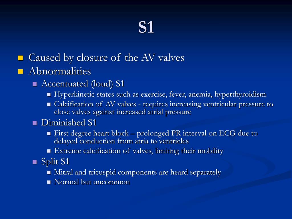 S1 • Caused by closure of the AV valves • Abnormalities • Accentuated (loud) S1 • Hyperkinetic states such as exercise, fever, anemia, hyperthyroidism • Calcification of AV valves - requires increasing ventricular pressure to close valves against increased atrial pressure • Diminished S1 • First degree heart block – prolonged PR interval on ECG due to delayed conduction from atria to ventricles • Extreme calcification of valves, limiting their mobility • Split S1 • Mitral and tricuspid components are heard separately • Normal but uncommon