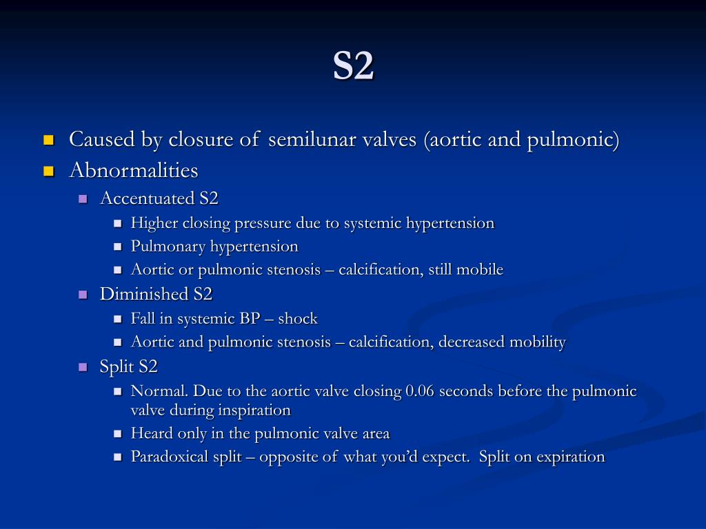 S2 • Caused by closure of semilunar valves (aortic and pulmonic) • Abnormalities • Accentuated S2 • Higher closing pressure due to systemic hypertension • Pulmonary hypertension • Aortic or pulmonic stenosis – calcification, still mobile • Diminished S2 • Fall in systemic BP – shock • Aortic and pulmonic stenosis – calcification, decreased mobility • Split S2 • Normal. Due to the aortic valve closing 0.06 seconds before the pulmonic valve during inspiration • Heard only in the pulmonic valve area • Paradoxical split – opposite of what you’d expect. Split on expiration