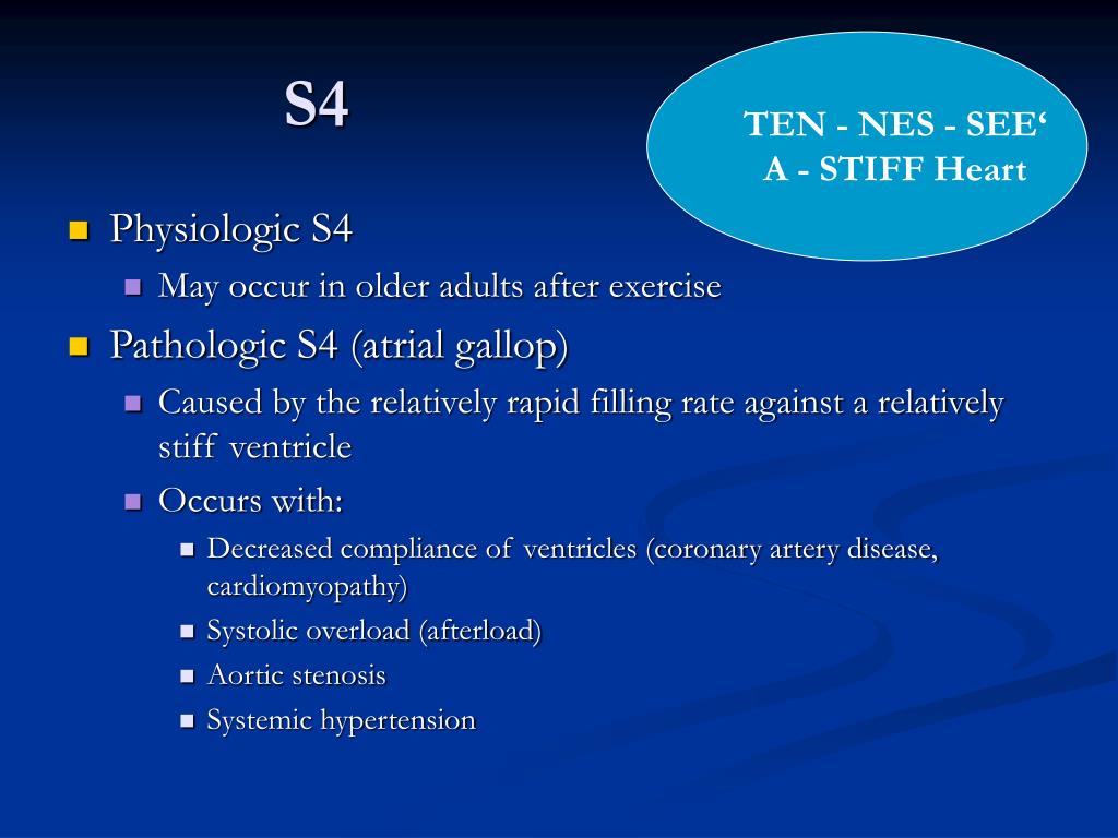 TEN - NES - SEE‘ • A - STIFF Heart S4 • Physiologic S4 • May occur in older adults after exercise • Pathologic S4 (atrial gallop) • Caused by the relatively rapid filling rate against a relatively stiff ventricle • Occurs with: • Decreased compliance of ventricles (coronary artery disease, cardiomyopathy) • Systolic overload (afterload) • Aortic stenosis • Systemic hypertension