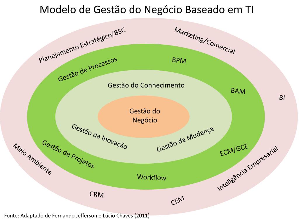 Modelo de Gestão do Negócio Baseado em TI Marketing/Comercial Planejamento Estratégico/BSC BPM Gestão de Processos Gestão do Conhecimento BAM BI Gestão do Negócio Gestão da Inovação Gestão da Mudança ECM/GCE Gestão de Projetos Meio Ambiente Inteligência Empresarial Workflow CRM CEM Fonte: Adaptado de Fernando Jefferson e Lúcio Chaves (2011)
