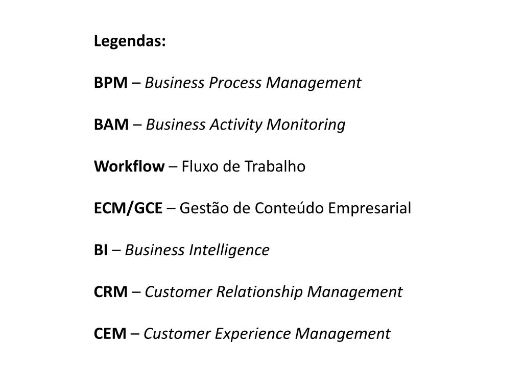 Legendas: BPM – Business Process Management BAM – Business ActivityMonitoring Workflow – Fluxo de Trabalho ECM/GCE – Gestão de Conteúdo Empresarial BI – Business Intelligence CRM – CustomerRelationship Management CEM – CustomerExperience Management