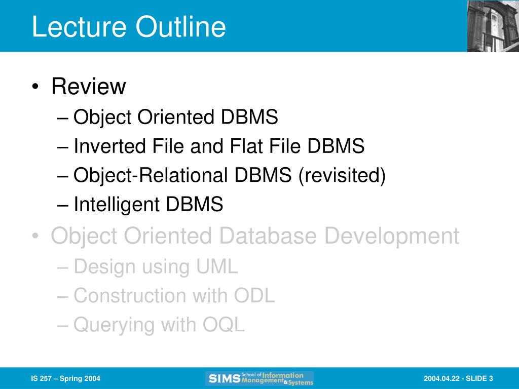 Object-Oriented Database Development (Hoffer Chap 15). University of California, Berkeley School of Information Management and Systems SIMS 257: Database Management. Lecture Outline. Review Object Oriented DBMS Inverted File and Flat File DBMS Object-Relational DBMS (revisited)