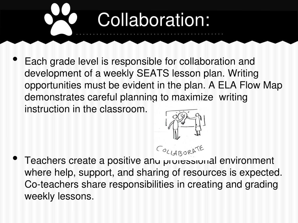 Collaboration: Each grade level is responsible for collaboration and development of a weekly SEATS lesson plan. Writing opportunities must be evident in the plan. A ELA Flow Map demonstrates careful planning to maximize writing instruction in the classroom. Teachers create a positive and professional environment where help, support, and sharing of resources is expected. Co-teachers share responsibilities in creating and grading weekly lessons.