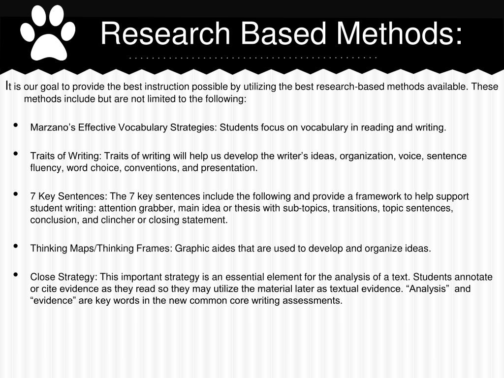 Research Based Methods: It is our goal to provide the best instruction possible by utilizing the best research-based methods available. These methods include but are not limited to the following: Marzano’s Effective Vocabulary Strategies: Students focus on vocabulary in reading and writing. Traits of Writing: Traits of writing will help us develop the writer’s ideas, organization, voice, sentence fluency, word choice, conventions, and presentation. 7 Key Sentences: The 7 key sentences include the following and provide a framework to help support student writing: attention grabber, main idea or thesis with sub-topics, transitions, topic sentences, conclusion, and clincher or closing statement. Thinking Maps/Thinking Frames: Graphic aides that are used to develop and organize ideas. Close Strategy: This important strategy is an essential element for the analysis of a text. Students annotate or cite evidence as they read so they may utilize the material later as textual evidence. “Analysis” and “evidence” are key words in the new common core writing assessments.