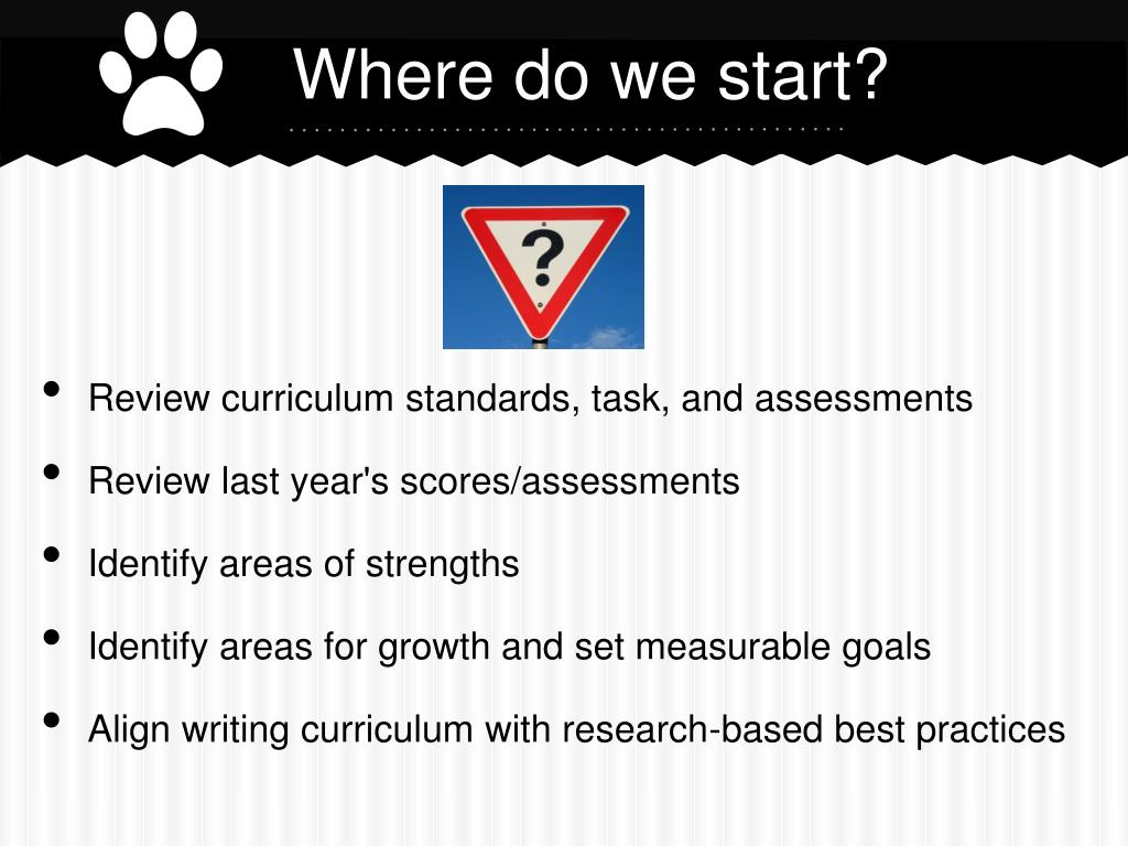 Where do we start? Review curriculum standards, task, and assessments Review last year's scores/assessments Identify areas of strengths Identify areas for growth and set measurable goals Align writing curriculum with research-based best practices