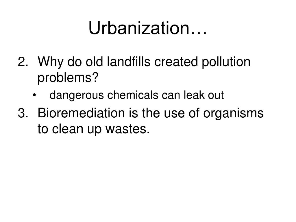 Urbanization… • Why do old landfills created pollution problems? • dangerous chemicals can leak out • Bioremediation is the use of organisms to clean up wastes.