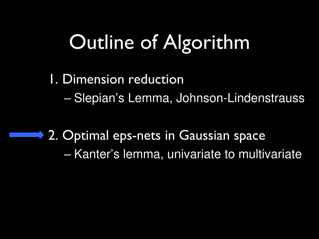 Outline of Algorithm 1. Dimension reduction • Slepian’s Lemma, Johnson-Lindenstrauss 2. Optimal eps-nets in Gaussian space • Kanter’s lemma, univariate to multivariate