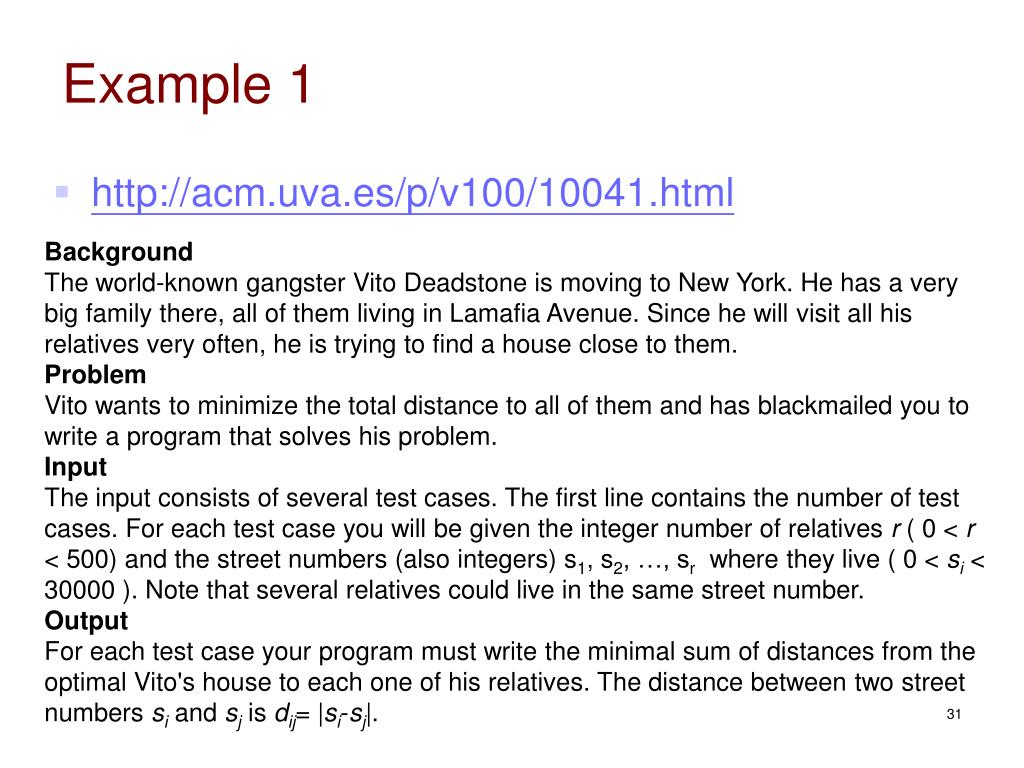 Example 1 • http://acm.uva.es/p/v100/10041.html Background The world-known gangster Vito Deadstone is moving to New York. He has a very big family there, all of them living in Lamafia Avenue. Since he will visit all his relatives very often, he is trying to find a house close to them. Problem Vito wants to minimize the total distance to all of them and has blackmailed you to write a program that solves his problem. Input The input consists of several test cases. The first line contains the number of test cases. For each test case you will be given the integer number of relatives r ( 0 < r < 500) and the street numbers (also integers) s1, s2, …, sr where they live ( 0 < si < 30000 ). Note that several relatives could live in the same street number. Output For each test case your program must write the minimal sum of distances from the optimal Vito's house to each one of his relatives. The distance between two street numbers si and sj is dij= |si-sj|.
