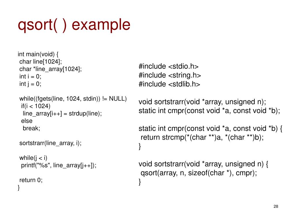 qsort( ) example int main(void) { char line[1024]; char *line_array[1024]; int i = 0; int j = 0; while((fgets(line, 1024, stdin)) != NULL) if(i < 1024) line_array[i++] = strdup(line); else break; sortstrarr(line_array, i); while(j < i) printf("%s", line_array[j++]); return 0; } #include <stdio.h> #include <string.h> #include <stdlib.h> void sortstrarr(void *array, unsigned n); static int cmpr(const void *a, const void *b); static int cmpr(const void *a, const void *b) { return strcmp(*(char **)a, *(char **)b); } void sortstrarr(void *array, unsigned n) { qsort(array, n, sizeof(char *), cmpr); }