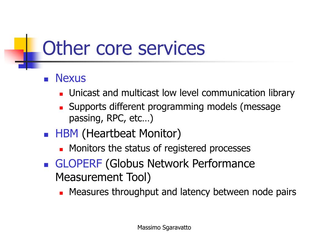 Core Services • Security (GSI) • Information Service (MDS) • Resource Management (GRAM) • Remote Data Access (GASS) • Communication (Nexus) • Network Performance Monitor (GLOPERF) • Fault detection (HBM) • Executable Management (GEM) (???) Massimo Sgaravatto