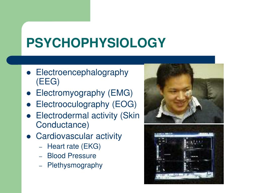PSYCHOPHYSIOLOGY • Electroencephalography (EEG) • Electromyography (EMG) • Electrooculography (EOG) • Electrodermal activity (Skin Conductance) • Cardiovascular activity • Heart rate (EKG) • Blood Pressure • Plethysmography