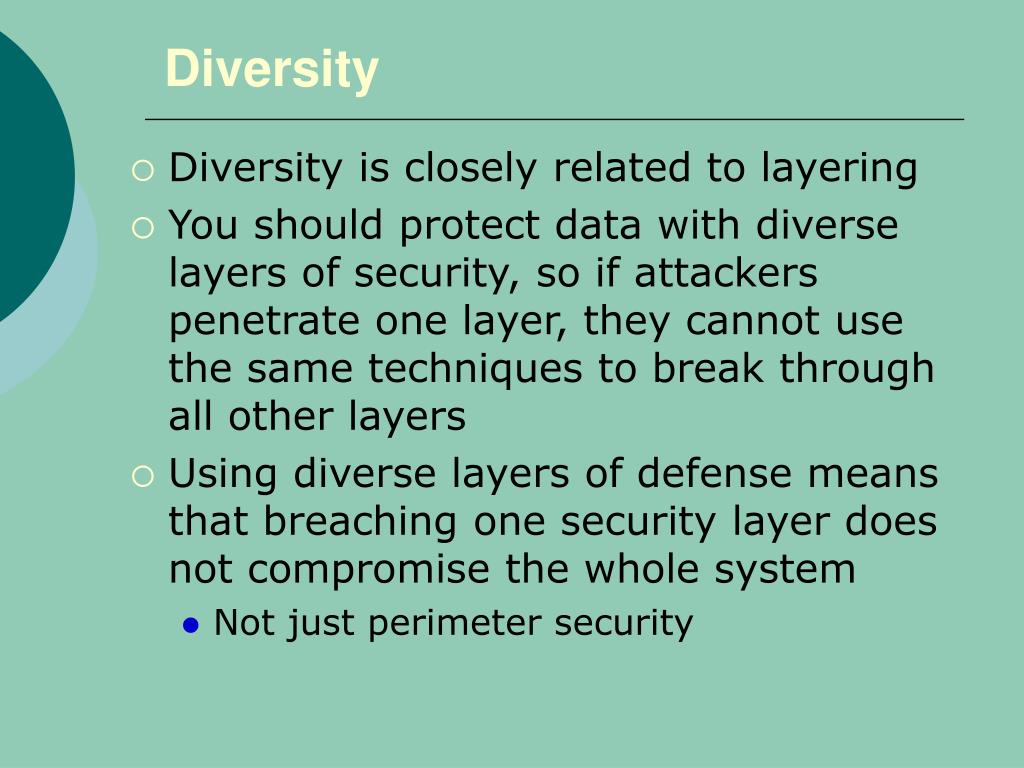 Diversity • Diversity is closely related to layering • You should protect data with diverse layers of security, so if attackers penetrate one layer, they cannot use the same techniques to break through all other layers • Using diverse layers of defense means that breaching one security layer does not compromise the whole system • Not just perimeter security