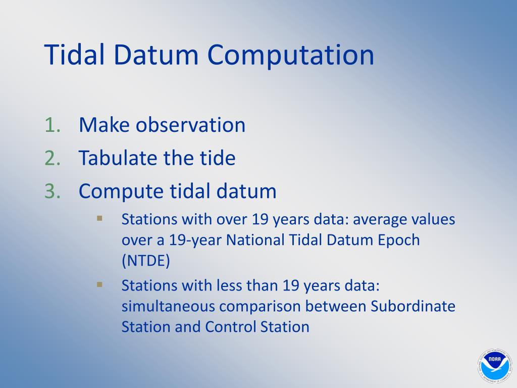 Tidal Datum Computation • Make observation • Tabulate the tide • Compute tidal datum • Stations with over 19 years data: average values over a 19-year National Tidal Datum Epoch (NTDE) • Stations with less than 19 years data: simultaneous comparison between Subordinate Station and Control Station