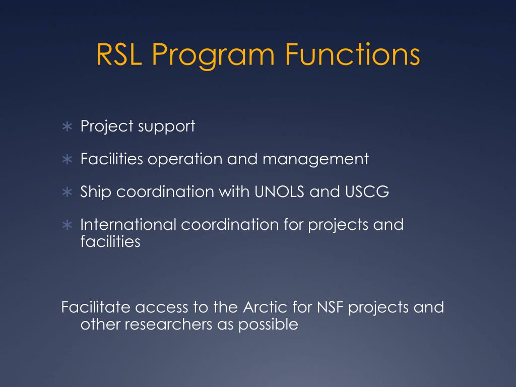 RSL Program Functions • Project support • Facilities operation and management • Ship coordination with UNOLS and USCG • International coordination for projects and facilities Facilitate access to the Arctic for NSF projects and other researchers as possible