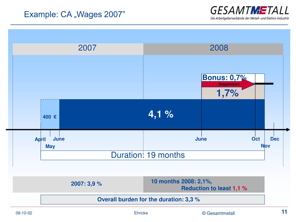 Example: CA „Wages 2007” 2007 2008 Bonus: 0,7% Suspension 1,7% 400 € 4,1 % June Oct Dec June April Nov May Duration: 19 months 10 months 2008: 2,1%, Reduction to least 1,1 % 2007: 3,9 % Overall burden for the duration: 3,3 %