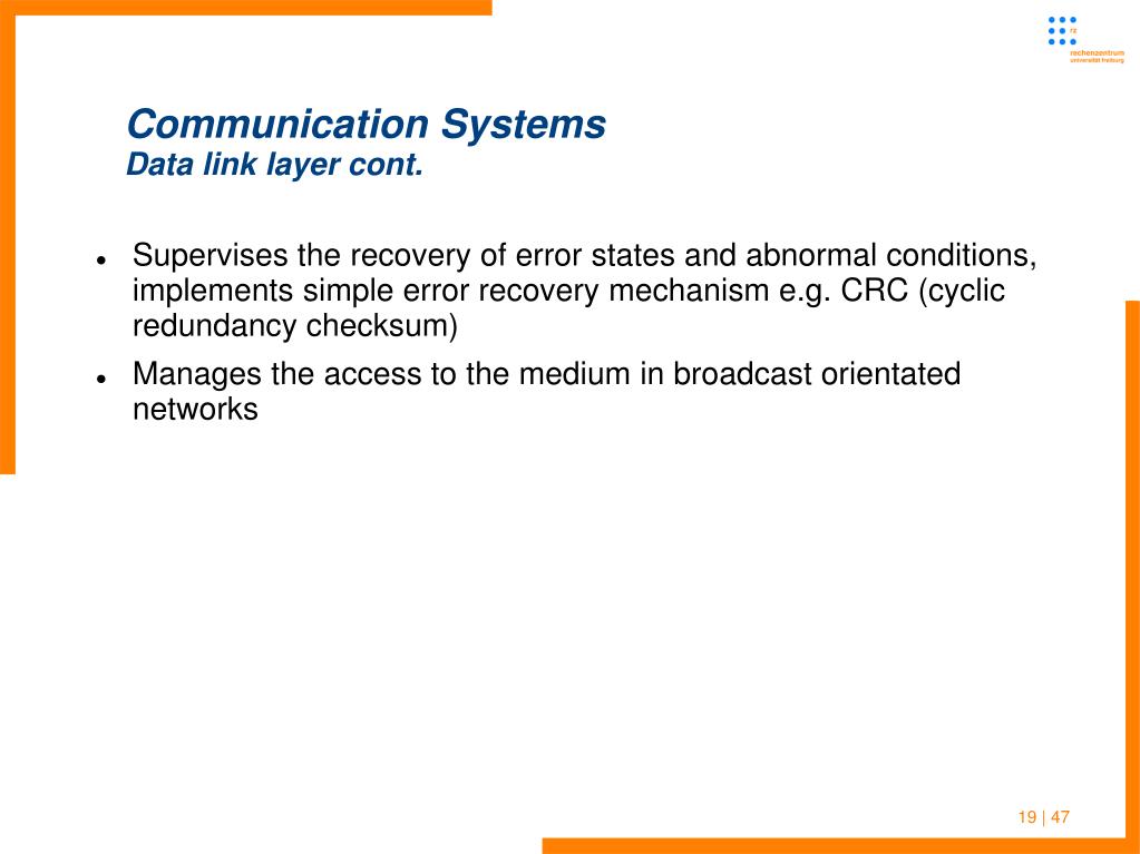 Communication SystemsData link layer cont. • Supervises the recovery of error states and abnormal conditions, implements simple error recovery mechanism e.g. CRC (cyclic redundancy checksum) • Manages the access to the medium in broadcast orientated networks 19 | 47