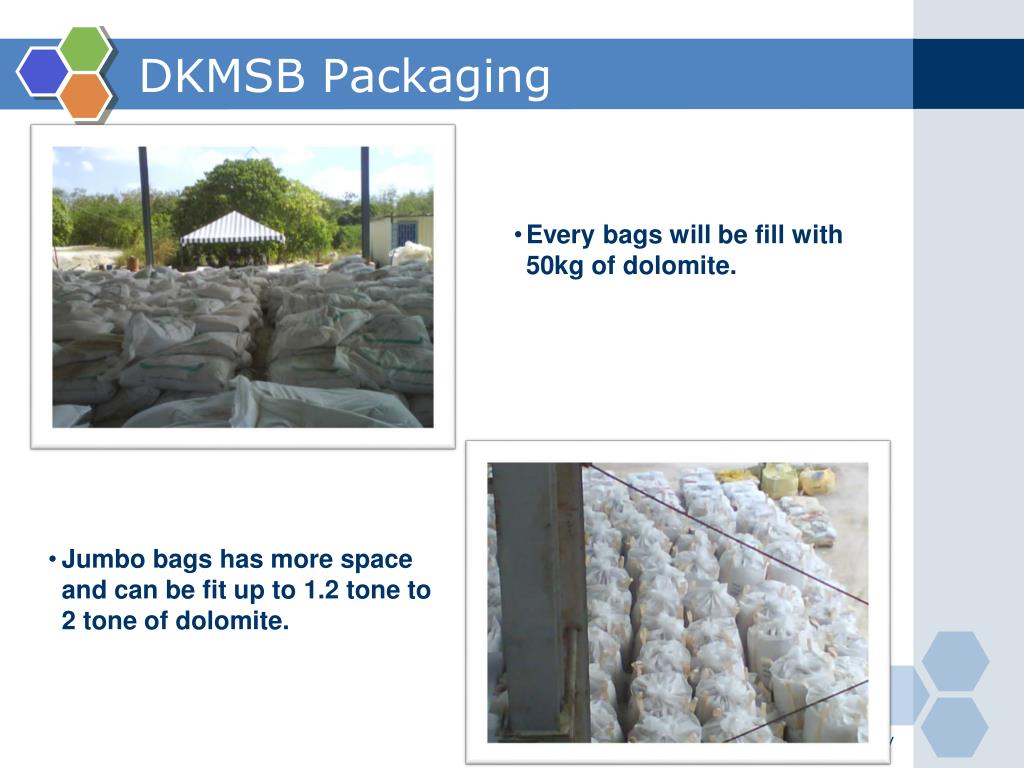 DKMSB Packaging • Every bags will be fill with 50kg of dolomite. • Jumbo bags has more space and can be fit up to 1.2 tone to 2 tone of dolomite. www.dkmsb.com.my