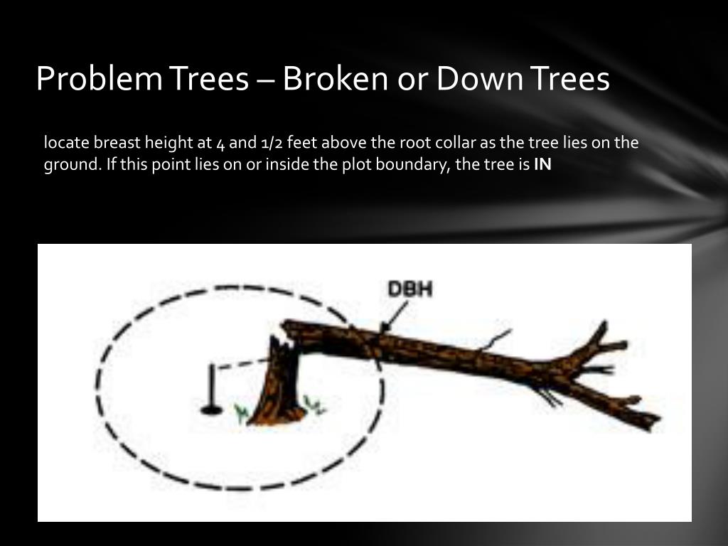 Problem Trees – Broken or Down Trees locate breast height at 4 and 1/2 feet above the root collar as the tree lies on the ground. If this point lies on or inside the plot boundary, the tree is IN