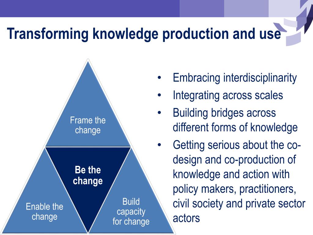 Transforming knowledge production and use Embracing interdisciplinarity Integrating across scales Building bridges across different forms of knowledge Getting serious about the co-design and co-production of knowledge and action with policy makers, practitioners, civil society and private sector actors